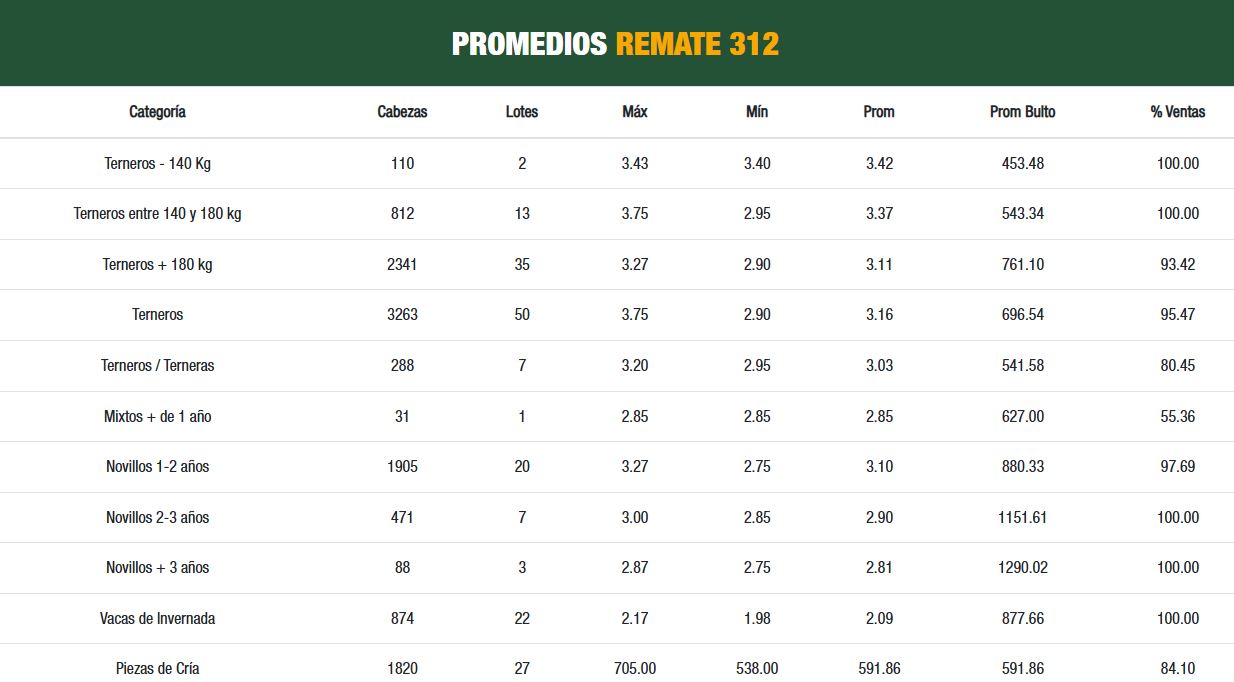 Entre los valores más relevantes de la jornada, los terneros hasta 140 kg promediaron US$/kg 3,42, los de 140 a 180 kg US$/kg 3,37, y los de más de 180 kg US$/kg 3,11, con una venta total de 95,5%. El promedio general de los terneros fue de U$S 3,16 por kg (-19 cents versus el remante anterior), pero con un valor al bulto de US$ 697, esto fue US$ 20 más que el remante anterior.