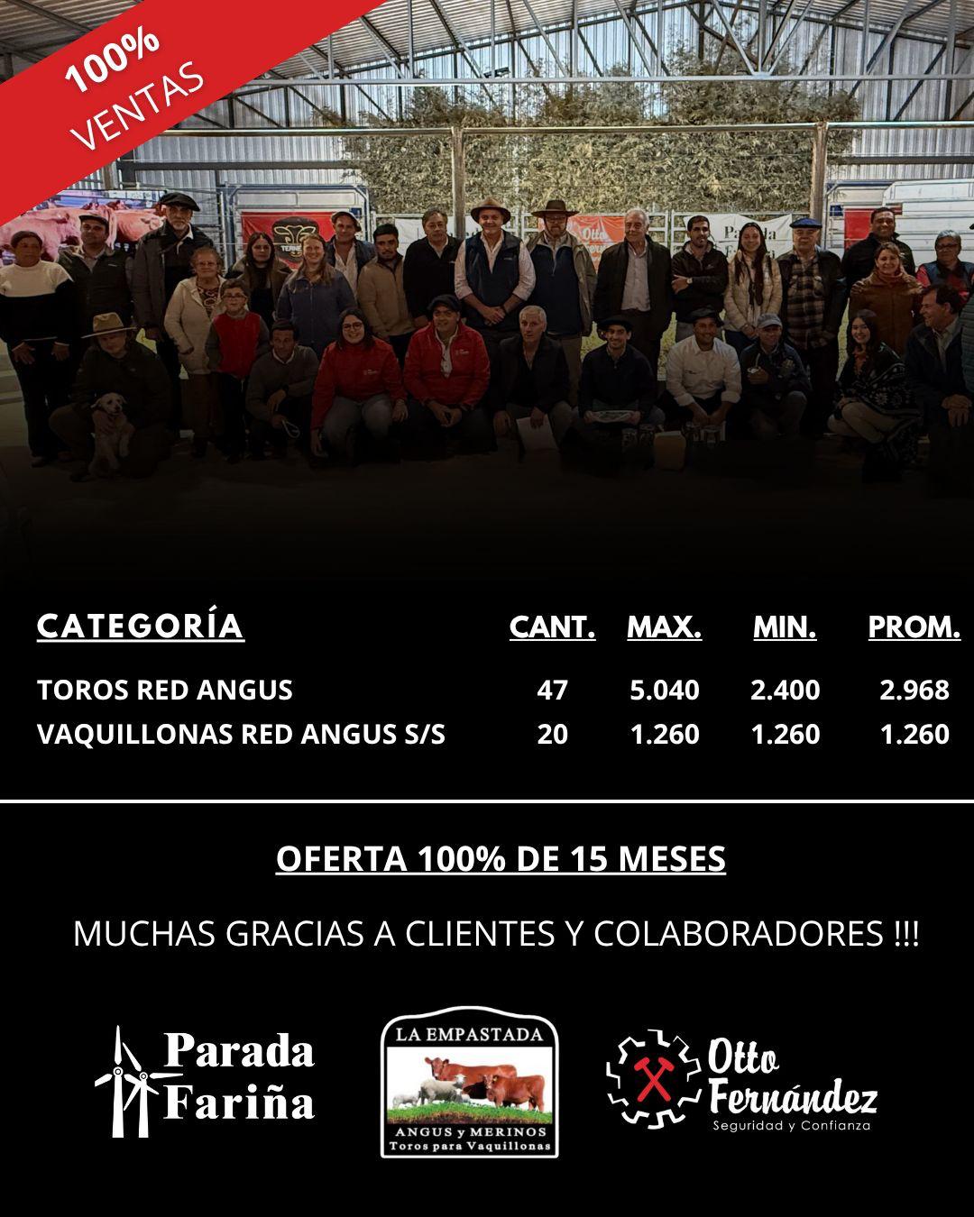 Los 47 toros Red Angus se vendieron a un promedio de US$ 2.968, con un máximo de US$ 5.040 y mínimo de US$ 2.400, bajo el martillo de Otto Fernández en el local Parada Fariña, Artigas. En tanto, las 20 vaquillonas Red Angus promediaron US$ 1.260. Los ejemplares se dispersaron hacia Artigas, Salto, Tacuarembó, Rivera, Cerro Largo y Rocha.