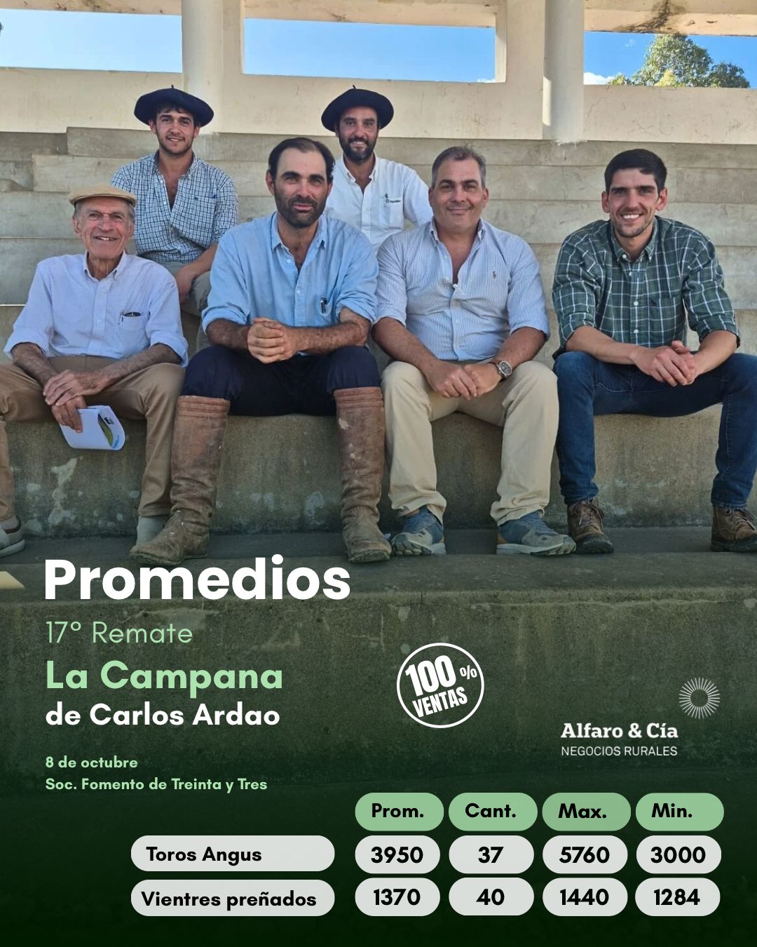 En una tarde de gran marco en la Sociedad de Fomento de Treinta y Tres, la cabaña La Campana de Carlos Ardao concretó con éxito su 17° remate anual, bajo la conducción del escritorio Alfaro & Cía., logrando la colocación del 100% de la oferta.