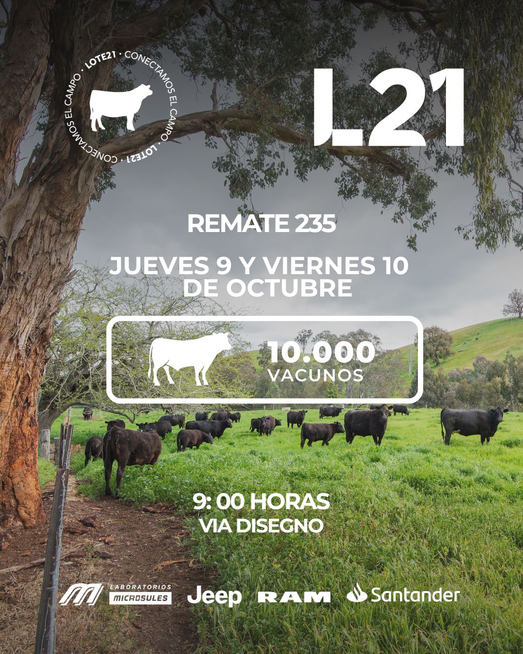 El consorcio Lote 21 realizará esta semana su remate 235, que se desarrollará en dos jornadas —jueves 9 y viernes 10 de octubre— desde las 9 horas, transmitido por VTV Rural y por su aplicación móvil.