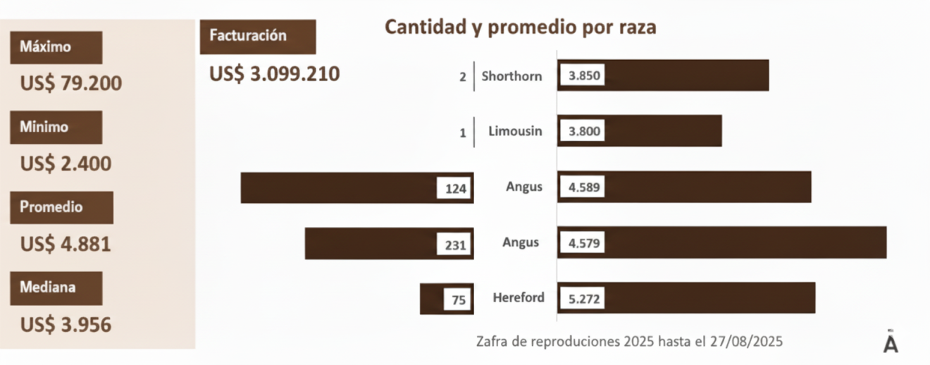 La zafra de reproductores comenzó a recobrar dinamismo. En la última semana se comercializaron 479 toros y dejó un acumulado de 635 animales al 27 de setiembre. Hasta ahora, la mediana pauta un valor de US$ 3.956 por toro y de US$ 4.881 para el promedio ponderado, con una facturación que superó ya los US$ 3 millones.